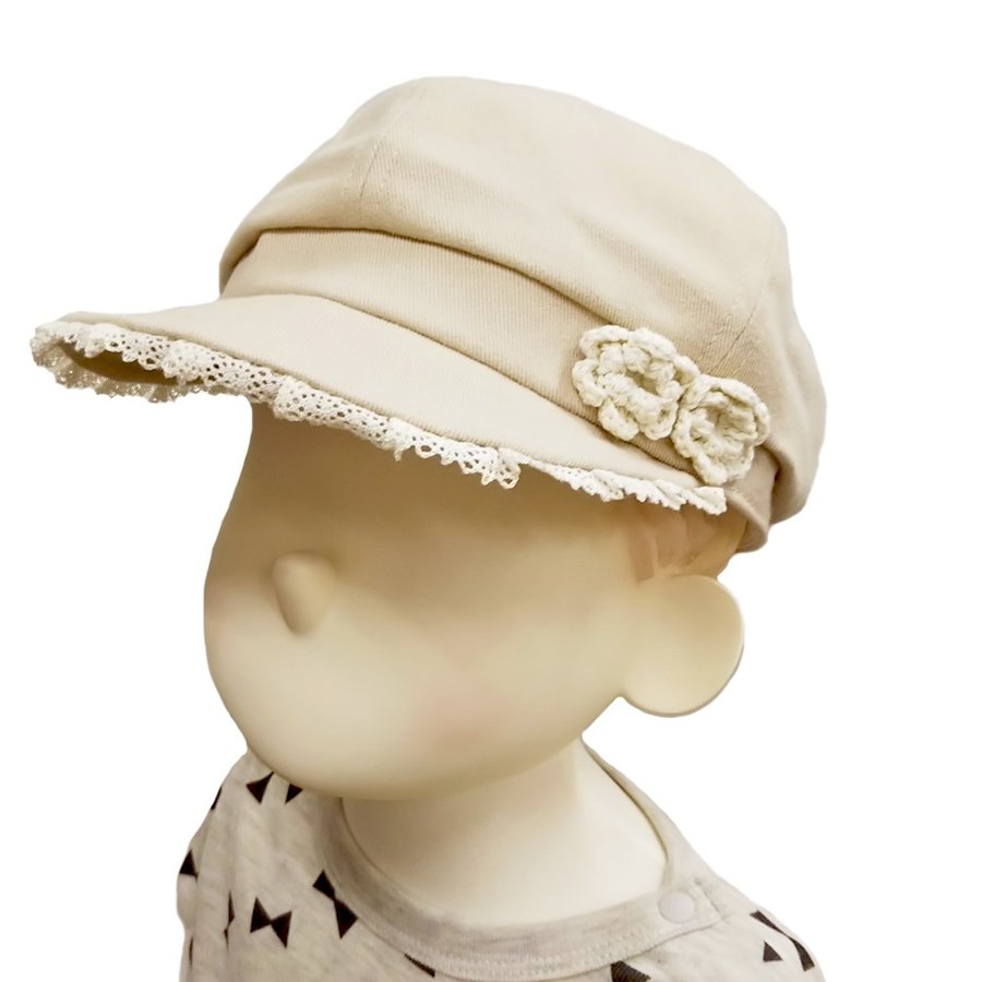 ベージュのキャスケットにあしらわれたレースや花モチーフが、女の子らしさを演出。