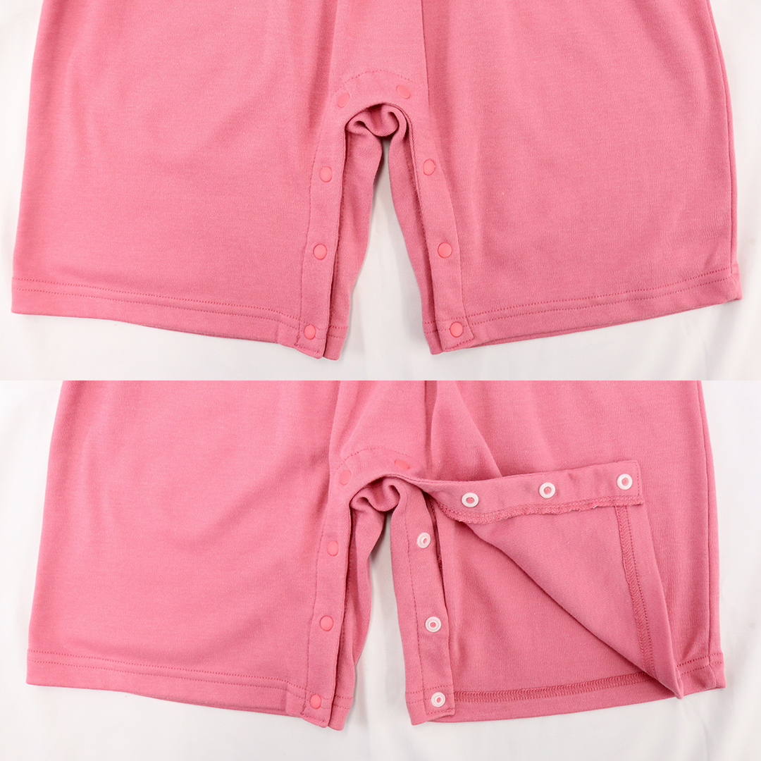 上下がつながったロンパース型で、股部分はスナップボタン仕様。