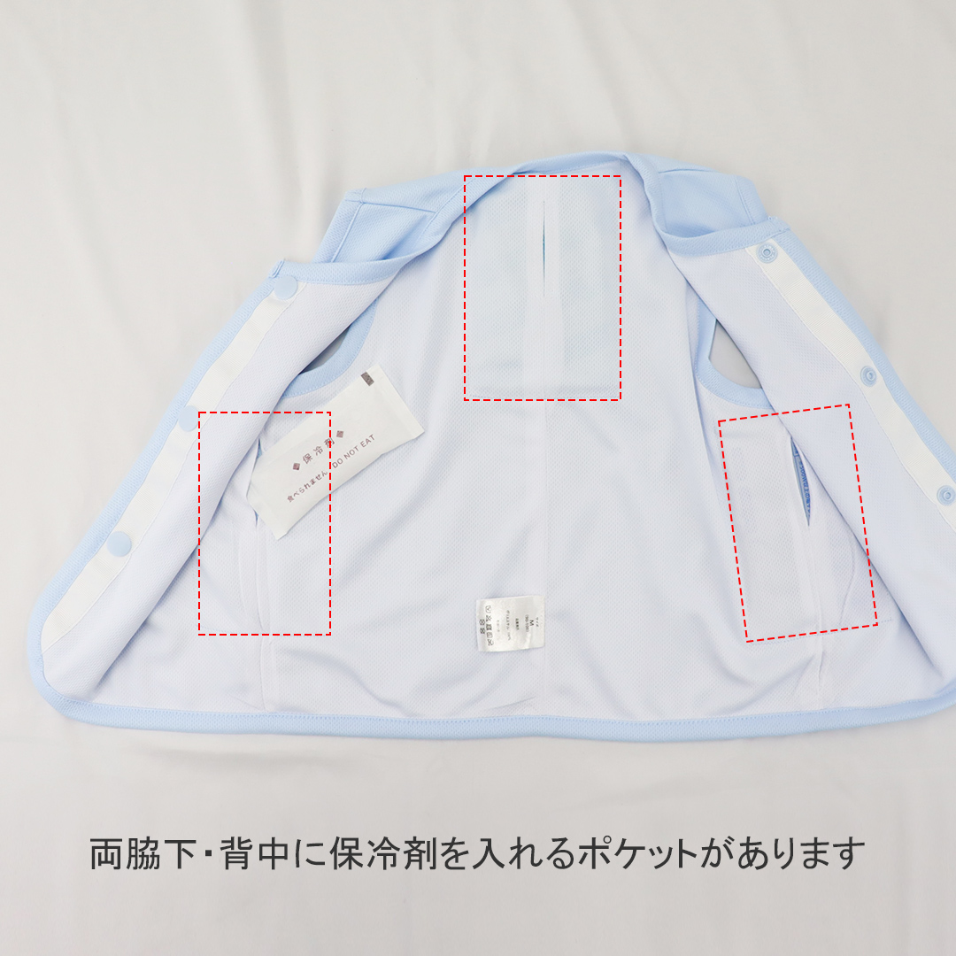 両脇下と背中部分に保冷剤ポケットを配置し、ズレにくい設計で効率よく冷やします。